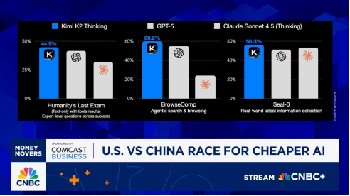 11月12日消息,据美国消费者新闻与商业频道(CNBC)报道,中美 AI 竞赛呈现日益增长的巨大反差。来自中国初创公司月之暗面发布的最新开源模型 Kimi K2 Thinking 在多项标准基准测试中表现出色,而其训练成本不到 500 万美元。这意味着美国的 AI 繁荣是建立在“借钱”之上,而中国更注重成本和效率。